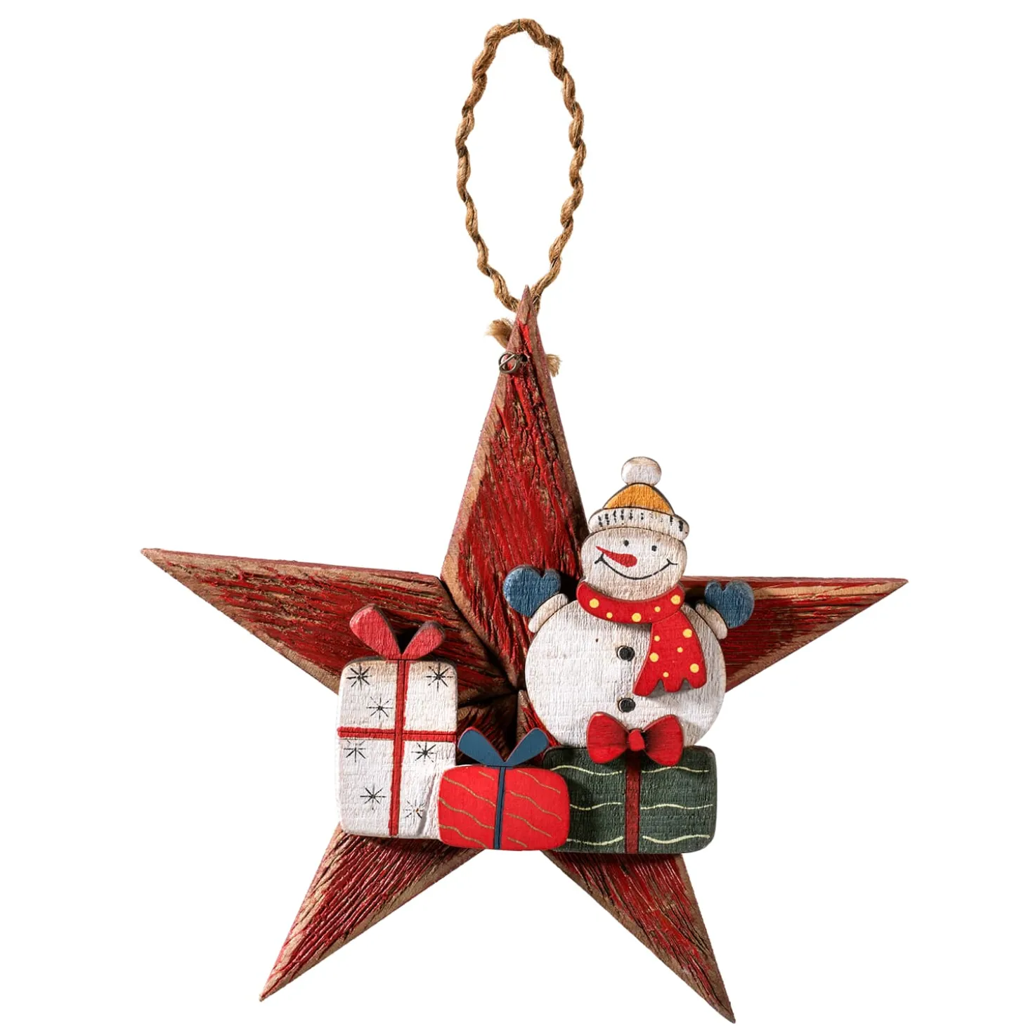 Wooden Star With Snowman With Gifts In Country Style