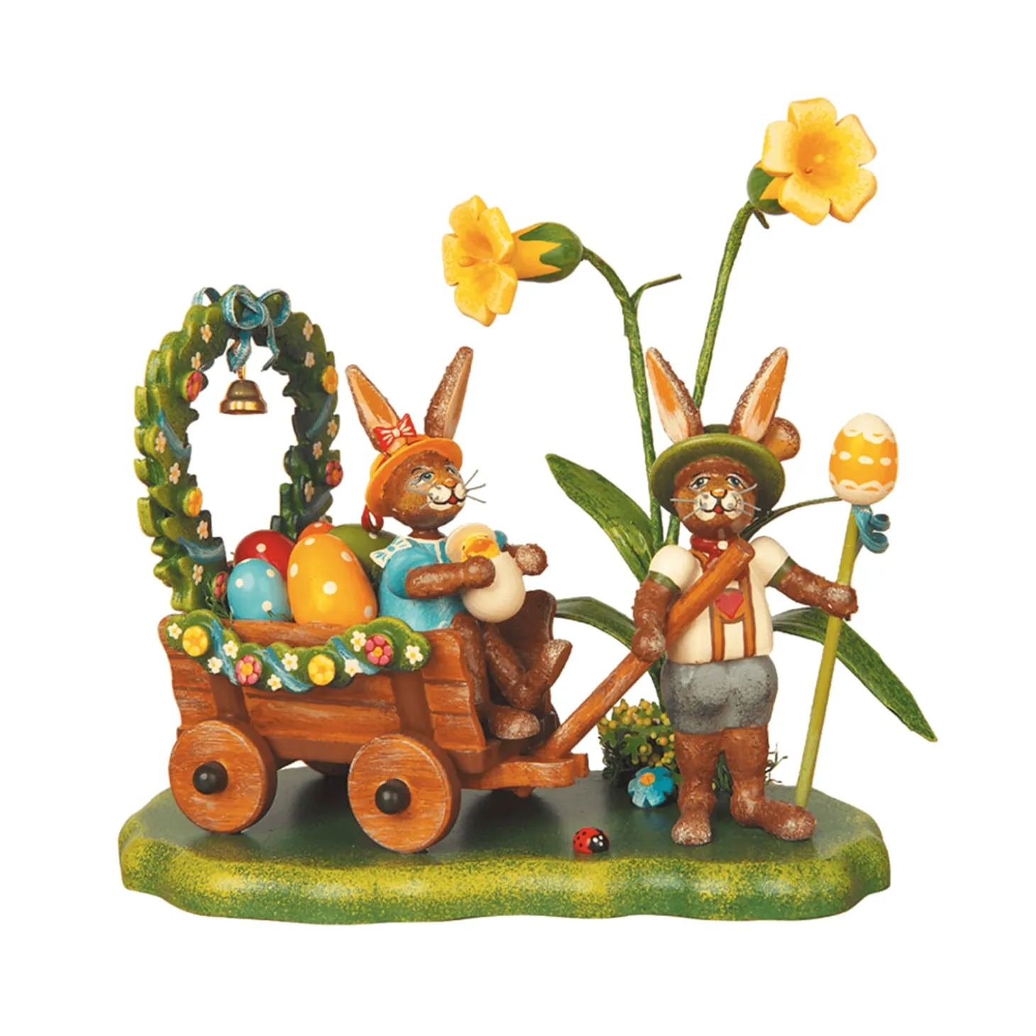 On The Spring Meadow By The Primroses We Meet These Two Happy Easter Rabbits. The Small Wagon Is Beautifully Decorated With Flowers And Easter Eggs And The Wreath Of Flowers Is Adorned With A Little Bell.